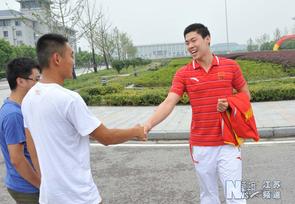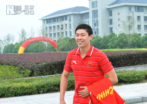 新华网江苏频道南京8月29日电 8月28日,南京东南大学新生开学,人文学院新生、奥运选手郝运来到学校,受到同学和老师的关注。