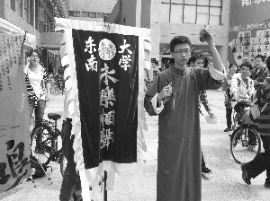 “长征的故事实在多,我接接连连往下说。就在那1934年,咱们红军长征直向前。冲垮了三道封锁线,冲破了敌军几十万……”作为东南大学永乐相声社的核心成员,孙昊打着竹板,行吟在广场上,4个同学一唱一和地跟在后面。还有同学打着“东南大学永乐相声”的幡子走在队伍中间。