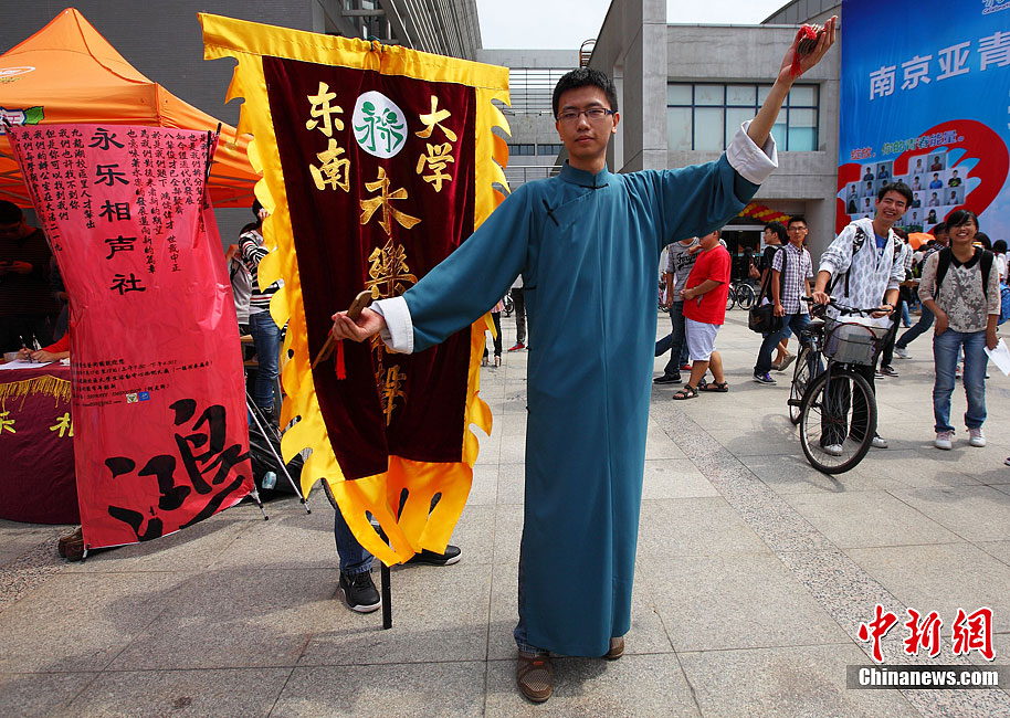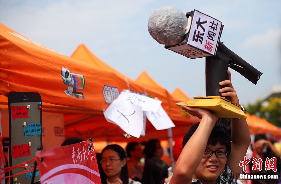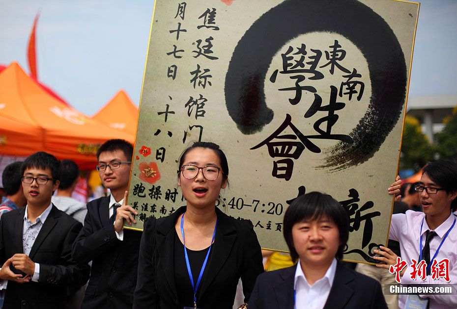 9月17日,一场“百团大战”作为南京东南大学2012新生文化季的重头戏在江宁校区内展开,科学技术、体育建设、文化艺术等五大类、120个学生社团联合招新,现场吹拉弹唱、吆喝声此起彼伏,各个社团纷纷以自己的特色来吸引了3000多名新生前来,一时间成为了校园内一道独特的人文景观。