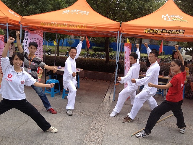 没错,就是像武侠电视剧里站在木桩上打拳!昨天,在热闹喧嚣的招新现场,东大梅花桩拳武术协会的骨干成员们清一色白色练功服,上书红色大字“梅花桩”,煞是惹眼。