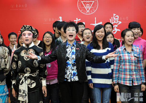 黄孝慈是东南大学兼职教授,给学生讲授中国传统文化课程。为了在大学生中普及传统戏剧,让爱好戏曲的同学有学戏、演戏的机会,她在学校支持下办起了这个学生剧社,不仅亲自担任指导老师,还将邀请各剧种更多的戏曲名家来为学生作指导。新华社记者 孙参 摄