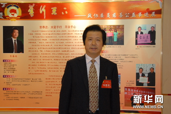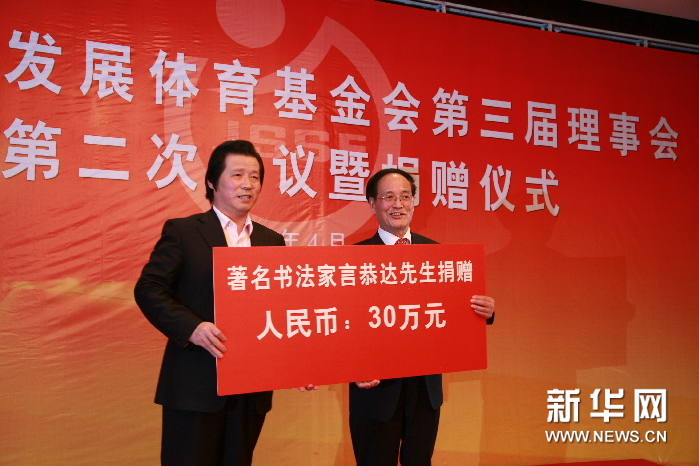 图片说明:言恭达当选全国政协首届“善行天下慈善公益人物”受到国家领导人的接见和颁奖. 言恭达文化基金会近日由江苏省民政厅正式批复在南京成立,这是以言恭达个人名义命名的非公募基金会,也是江苏书法艺术界唯一的文化基金会。 言恭达文化基金会以资助公益文化艺术事业,扶持文化艺术优秀人才,推进当代文化经典积累,促进海内外文化艺术交流,弘扬中华优秀文化为宗旨,为江苏乃至全国的公益慈善文化事业作出新的贡献。 图片说明:言恭达个人照片. 言恭达,1948年生,江苏常熟人。全国政协委员,中国文联全国委员会委员,中国书法家协会副主席,中国书法家协会教育委员会主任,中国国家画院院务委员,中国文化传媒中国美术院副院长,开明画院副院长,江苏省文学艺术界联合会副主席,江苏省文化发展基金会理事长。南京大学、东南大学兼职教授,博士研究生导师,东南大学中国书法研究院院长。国家一级美术师,享受国务院特殊津贴专家。 图片说明:言恭达为体育基金会捐款。 言恭达受业于著名书画家沙曼翁、宋文治先生,精多种书体,工篆刻、善绘画。作品参加过全国第二至第十届书法篆刻展、数届全国中青年书法作品展、国际书法展和当代名家书画篆刻作品展,先后在500多次国家级、国际性和各类全国性展览中入选并数次荣获大奖。作品还多次赴日本、韩国、新加坡、巴西、加拿大、美国、法国、菲律宾和中国台湾、香港、澳门等国家与地区交流,并于2010年11月在联合国总部“首届中文日”举办特展。2008年为北京第29届奥林匹克运动会创作的《我的中国心》长卷、2010年为上海第41届世界博览会创作的《城市让生活更美好》长卷和2011年国际apec夏威夷文化论坛展出的《世纪脊梁——言恭达书推动百年中国历史进程人物诗抄》长卷,2012年伦敦第30届奥林匹克运动会“创意城市•伦敦美术大会”创作展出的顾拜旦《体育颂》长卷,赢得海内外广泛赞誉。作品收入《中国现代美术全集》(书法卷和篆刻卷)、《中国当代书法大家》等500多种全国性专集。1987年全国“当代中青年《书苑撷英》评比”中,作品以最高评票被评为全国37位优秀作者之一。作品还被选刻于全国各地100多处碑林,并被中国国家博物馆、中国美术馆等国内外100多家博物馆、美术馆、纪念馆和中南海,人民大会堂布置与收藏。书学论文多篇参选“全国书学研讨会”,入选《当代中国书法论文选》,获“中国文联文艺评论一等奖”等。出版《抱云堂》书画专集与《抱云堂艺评》等专著,《当代书法名家》(字帖)及教材,参与合编《六体书字典》、《中国书法名作鉴赏辞典》等。