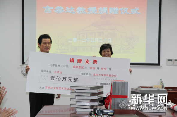 图片说明:言恭达向东南大学捐助100万元. 言恭达热衷于社会公益与慈善事业,多年来为四川汶川地震灾区、青海玉树地震灾区、江苏红十字孤儿学校、全国艾滋病防治、江苏省体育发展基金等无偿捐资800多万元,出资建立南京“言恭达百万慈善基金”、东南大学“言恭达百万教育基金”等。2008年被江苏省人民政府授予“博爱勋章”,2010年被国务院防治艾滋病工作机构授予“爱心形象大使”称号;2010年被授予全国政协首届“善行天下•政协委员慈善公益代表人物”,2011年荣获国家“第六届中华慈善奖•最具爱心行为楷模”称号等。