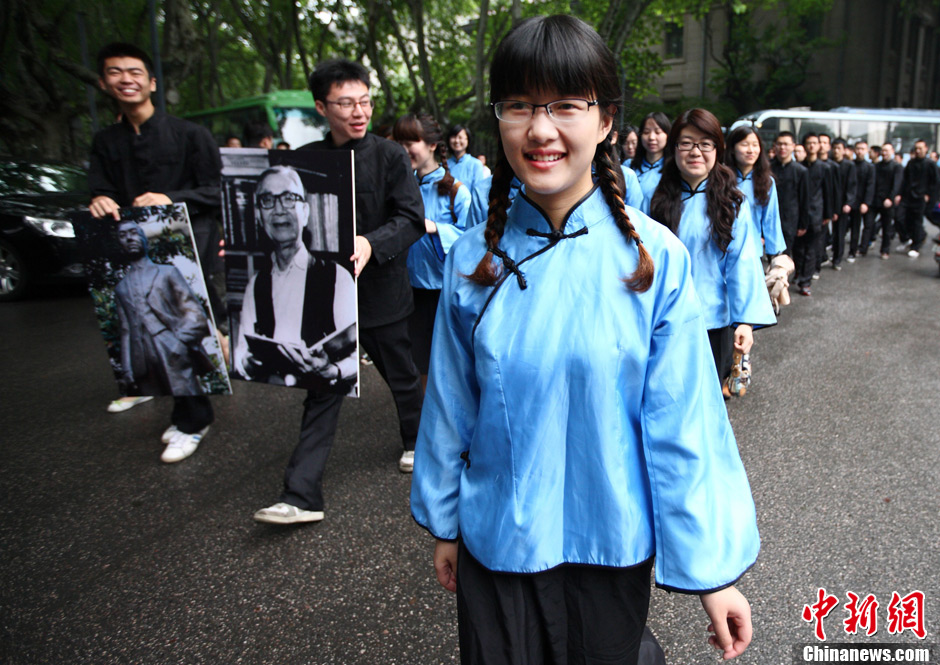 5月18日,90名身着上世纪二十年代学生服的东南大学土木学院应届毕业生颁奖大会前以“我的梦、大师梦”为题,在茅以升当年曾驻足徜徉的校园内最古老的六朝松下宣讲,缅怀先师、承继理想,让梦想再次起航。中新社发泱波摄