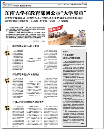 在公示的《东南大学章程》中还赋予了学生听证的权利,这意味着,将来学生可以邀请家人、朋友甚至律师来通过举证、 自辩等方式,来维护权益,这显然是一大进步。