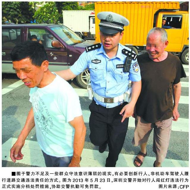 与此同时,应加强行人、非机动车驾驶人交通违法行为的执法查处,这有利于树立规则公平、权利公平环境,也能在一定程度上消弥“中国式过马路”引发的城市交通混乱。但是,囿于警力不足及一些群众守法意识薄弱现实,有必要创新行人、非机动车驾驶人履行道路交通违法责任的方式,确立违法行为人选择观看交通事故录像、路口辅助执勤等替代方式,推进对拒不履行法律责任者公布违法事实、纳入社会征信系统记录等配套制度的建设。