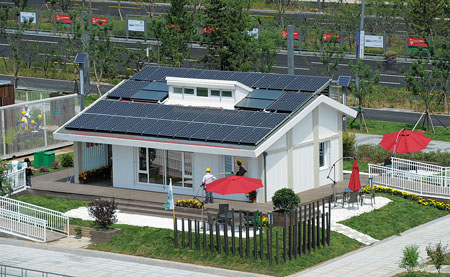 东南大学参赛队的太阳屋有着山西传统民居的坡顶。太阳屋外有一个约500平方米的大花园,有3个休闲区。“我们房子最大的特点就是空间本身”。涂欢向记者介绍说,我们的房子外围有一个平台,起到室外交通的作用,这个平台是用废弃的塑料、木屑等材料做成的,有耐风雨、防腐蚀、防火等特点。从平台下来,就是白色的石子路和草坪,顺着石子路,就可走到休闲区。院内还配备了可移动的落地太阳能灯,供院内夜晚照明。