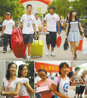 上图:迎新志愿者接新生。左下图:双胞胎姐妹同圆大学梦。右下图:为贫困生搭建多条“绿色通道”,发放“新生爱心基金”。 本报记者 余 萍摄
