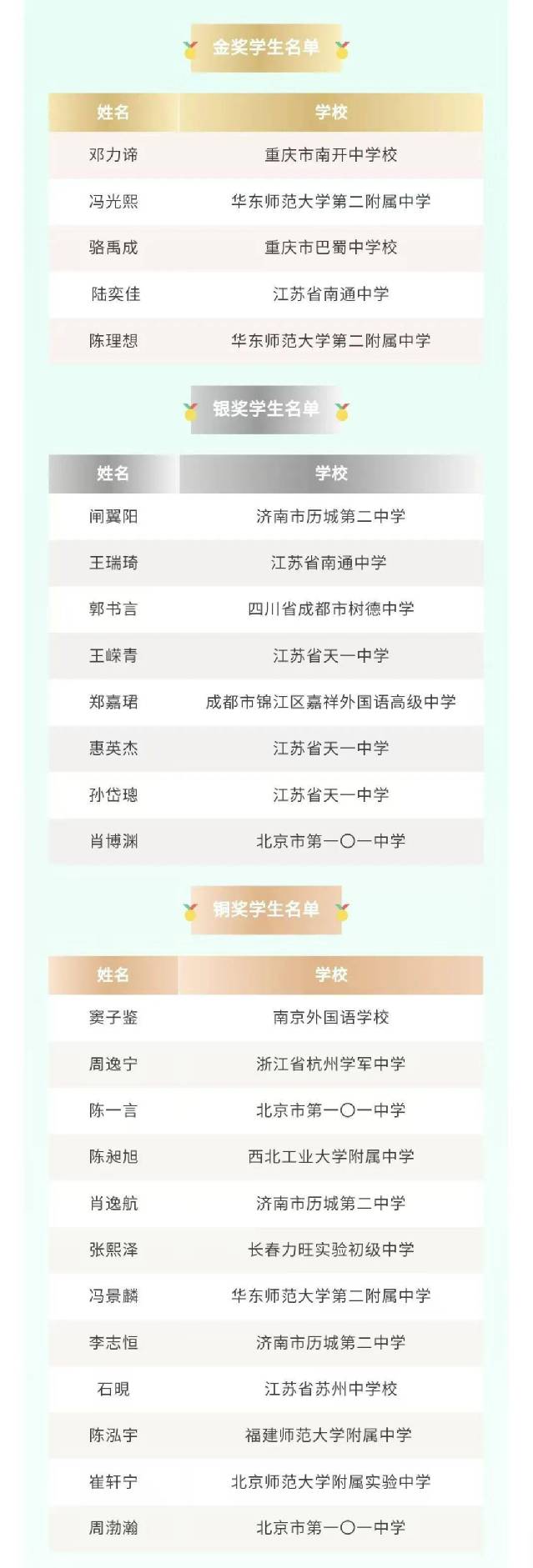 江苏共7人获奖,江苏省南通中学陆奕佳同学(男)荣获金奖,成为全国仅有的5位金奖得主之一,也是江苏省唯一的金奖获得者。江苏省南通中学王瑞琦、江苏省天一中学王嵘青、惠英杰、孙岱璁获银奖,南京外国语学校窦子鉴、江苏省苏州中学校石睍获铜奖。