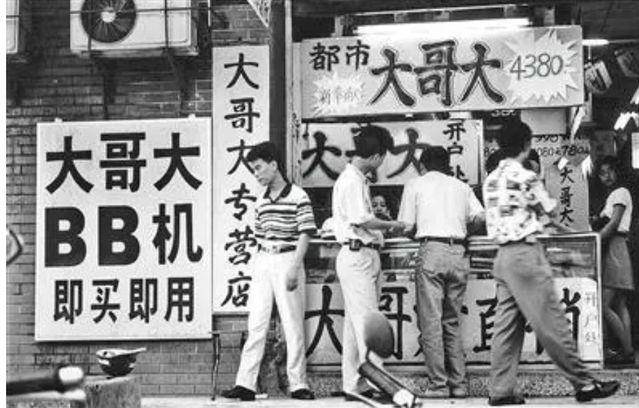 ○ 当时的“大哥大”是身份象征,一部售价高达2万元,很多家庭是固定电话,条件好的用BP机(BB机)。一条讯息需要先转寻呼台,通信效率低下,充满时代烙印。