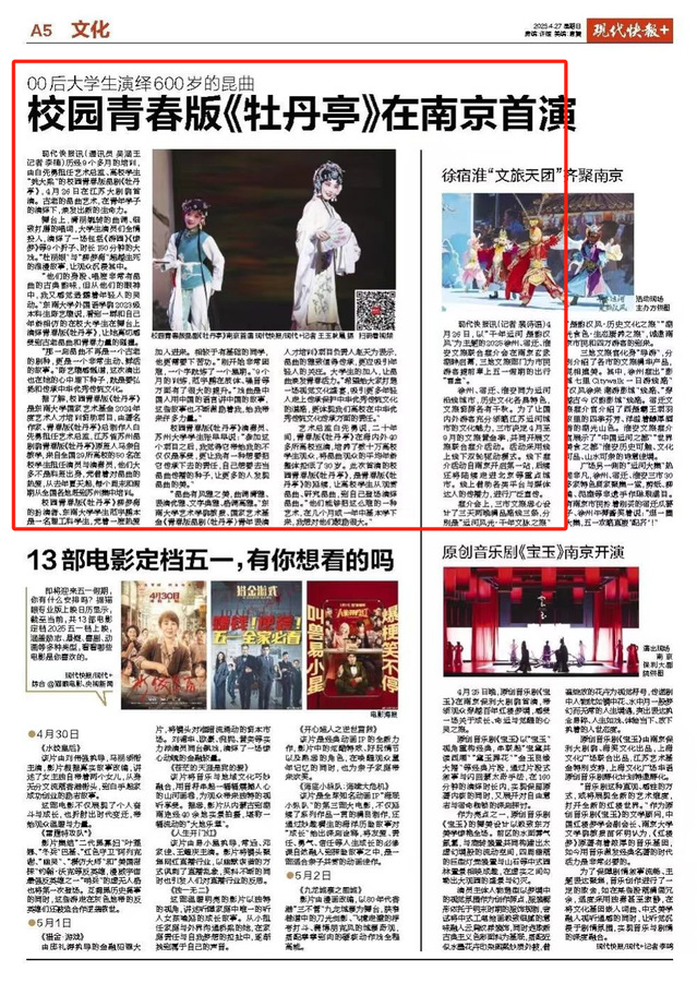 “他们在舞台上的时候,那些身段唱腔非常有昆曲的古典韵味。但从他们的眼神中,我感觉又透露着年轻人的灵动。”东南大学外国语学院2023级本科生陈艺璇说,看到一群和自己年龄相仿的在校大学生在舞台演绎青春版《牡丹亭》,她特别真切地感受到古老昆曲和青春力量的碰撞。