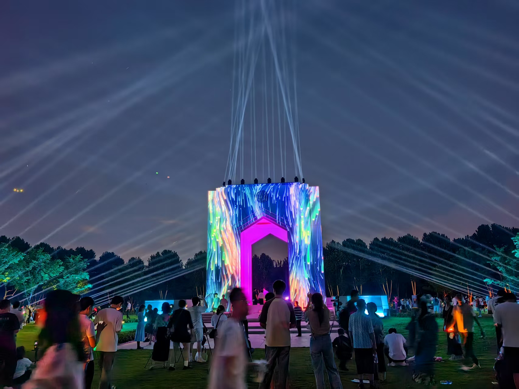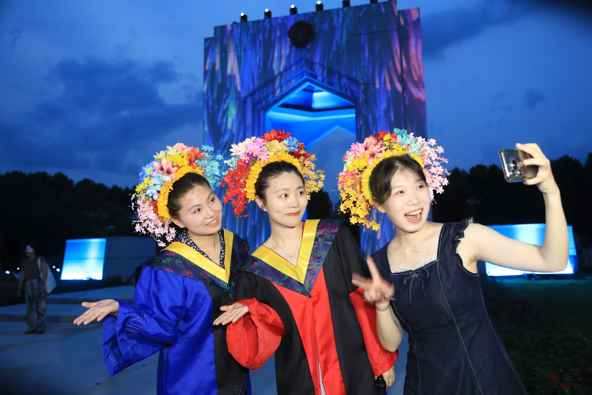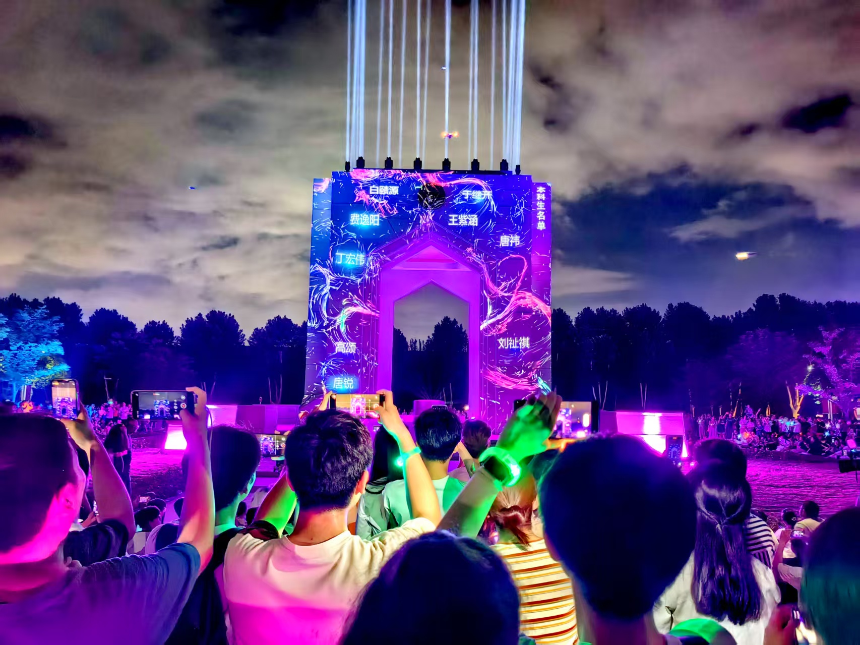 当夜幕降临,至善亭化身星光交织的液态建筑,四面立体投影首次亮相,通过粒子瀑布、AI实时渲染等技术,呈现高铁智轨、探月车、三峡大坝等象征东大科研成就的恢弘场景。校史名人的光影与毕业生们举起的手环光亮交相辉映,当同学们惊喜看到自己的名字在浩渺星云中如烟花盛放,欢呼不断,纷纷拿起手机拍照合影,将瞬间定格成永恒。