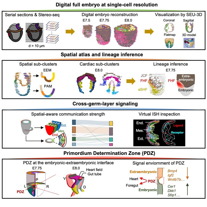 6月18日,东南大学林承棋、罗卓娟、谢芃团队以《小鼠早期器官发生期完整胚胎数字重建》(Digital Reconstruction of Full Embryos During Early Mouse Organogenesis)为题,在国际顶级期刊《Cell》在线发表研究成果,首次构建覆盖小鼠原肠运动后期至心脏等器官原基形成期的单细胞精度三维数字胚胎,在胚内-胚外界面发现中内胚层器官原基决定区(Primordium Determination Zone, PDZ),揭示心脏、前肠等器官原基发育的独特信号微环境。这项突破不仅填补了哺乳动物心脏早期发育理论空白,更为先天性心脏病等出生缺陷防治与再生医学研究提供关键理论基础。