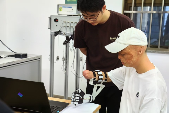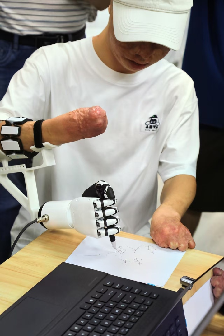 交汇点讯 握拳、张开、翻腕,再次握拳、张开、翻腕……这些对普通人来说再平常不过的动作,却让来自安徽池州的“烧伤”男孩方益凡十分惊喜。“东大我来了”,操纵着并不太熟悉的机械手臂,小方缓慢地在纸上写下此刻心声,同时也感受到了久违的来自手指的力触觉反馈。“冰冷的机械手臂似乎与我产生了某种联系!”