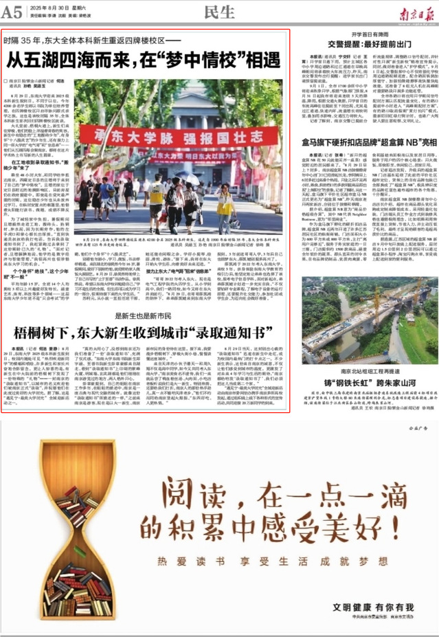 大礼堂前、梧桐大道上,新生们来往穿梭,他们的脸上洋溢着青春的笑容。新生中有励志的“工地搬砖少年”,有身怀“十八般武艺”的少年生,还有接力上同一所大学的“电气哥”和“信息弟”……他们从五湖四海会聚南京,都将在这片学术热土书写新的人生篇章。