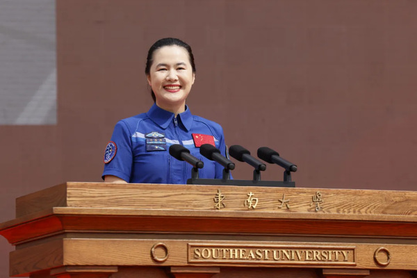 在师生们的热切期盼中,东南大学校友、中国首位女性航天飞行工程师、神舟十九号载人飞行任务航天员王浩泽从“学术之门”中走出,现场爆发出热烈的掌声。