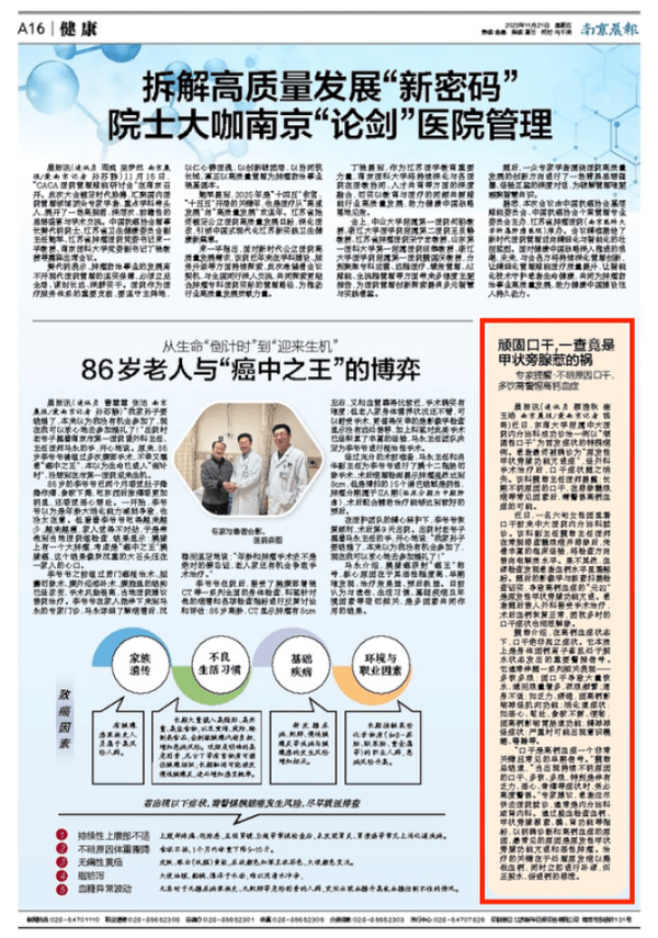 晨报讯(通讯员 蔡逸秋 崔玉艳 南京晨报/爱南京记者 钱鸣)近日,东南大学附属中大医院内分泌科成功诊治一例以“顽固性口干”为首发症状的特殊病例。患者最终被确诊为“原发性甲状旁腺功能亢进症”,经外科手术治疗后,口干症状随之消失。该科魏琼主任医师提醒:长期不明原因的口干,在排除糖尿病等常见因素后,需警惕高钙血症的可能。