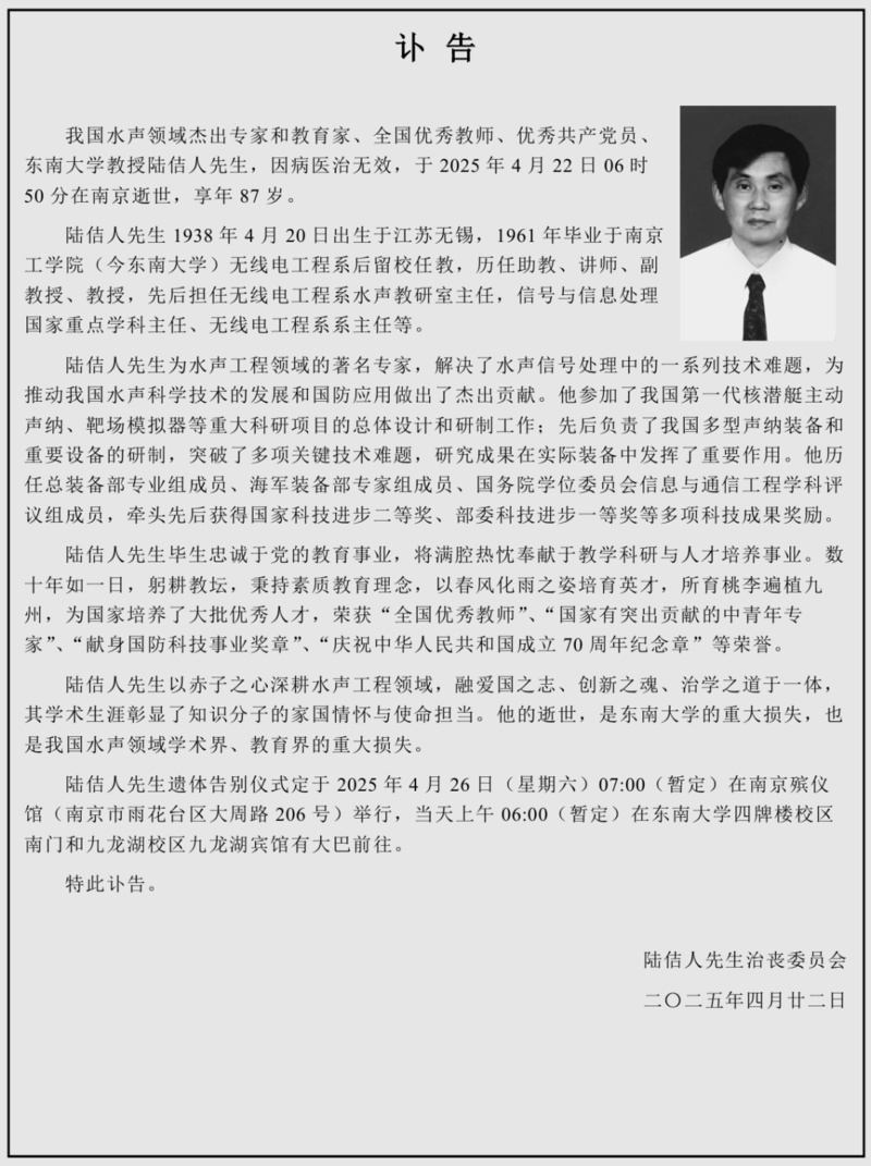 据“东大信息”微信公众号消息,我国水声领域杰出专家和教育家、全国优秀教师、优秀共产党员、东南大学教授陆佶人先生,因病医治无效,于2025年4月22日06时50分在南京逝世,享年87岁。