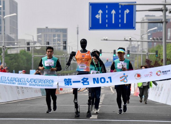 4月19日,天工队选手天工Ultra(左二)在比赛中冲向终点。当日,2025北京亦庄半程马拉松暨人形机器人半程马拉松在北京亦庄举行。新华社记者 李欣 摄