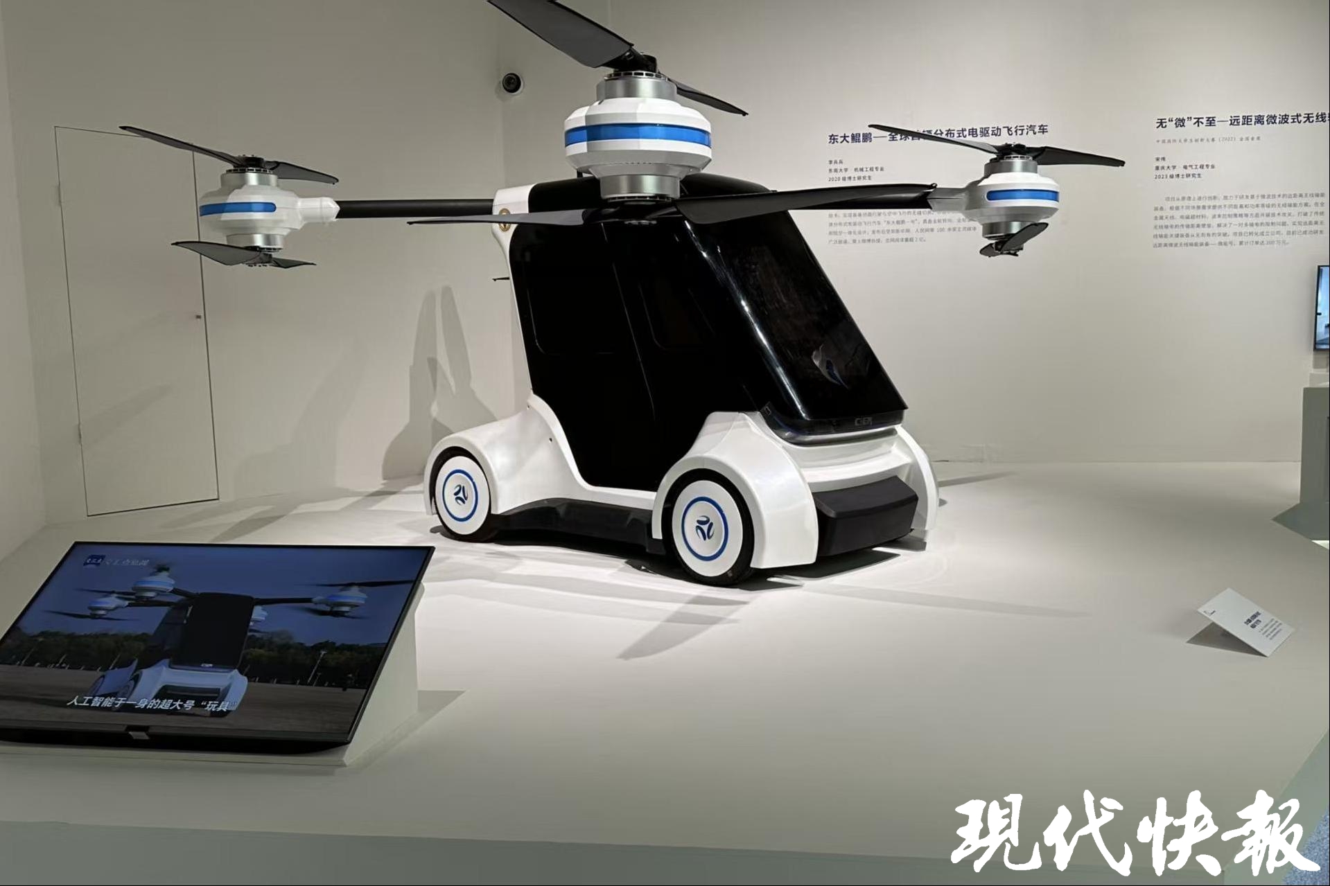 现代快报讯(通讯员 庄伟超 记者 李楠)4月29日,由教育部、文化和旅游部联合主办的“青春之歌——全国大学生创新成果展”在中国国家博物馆开幕。东南大学自主研发的“东大鲲鹏——全球首辆分布式电驱动飞行汽车”作为学校科技创新代表项目首次在中国国家博物馆参展。