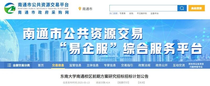 5月13日,南通市公共资源交易平台发布了《东南大学南通校区前期方案研究招标招标计划公告》。根据公告,东南大学南通校区项目计容面积约43万平方米,中标人须完成东南大学南通校区前期方案研究,合同估算价为1800万元。这意味着,东南大学南通校区筹建工程迈出了坚实的一步。