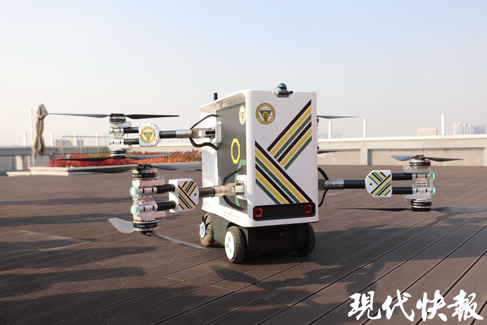 现代快报讯(通讯员 吴涵玉 记者 李楠/文 王玉秋晨/摄)1月23日,东南大学九龙湖校区湖畔,一辆飞行汽车缓缓升空,越过粼粼湖面,不到2分钟,稳稳降落在对岸三江楼五楼的户外平台。这是东南大学汽车科研团队研发的“东大·鲲鹏2号”,不仅更轻便,机臂还可以折叠。打开前就像一个储物箱,打开后则变成了一个可以飞行的储物汽车。