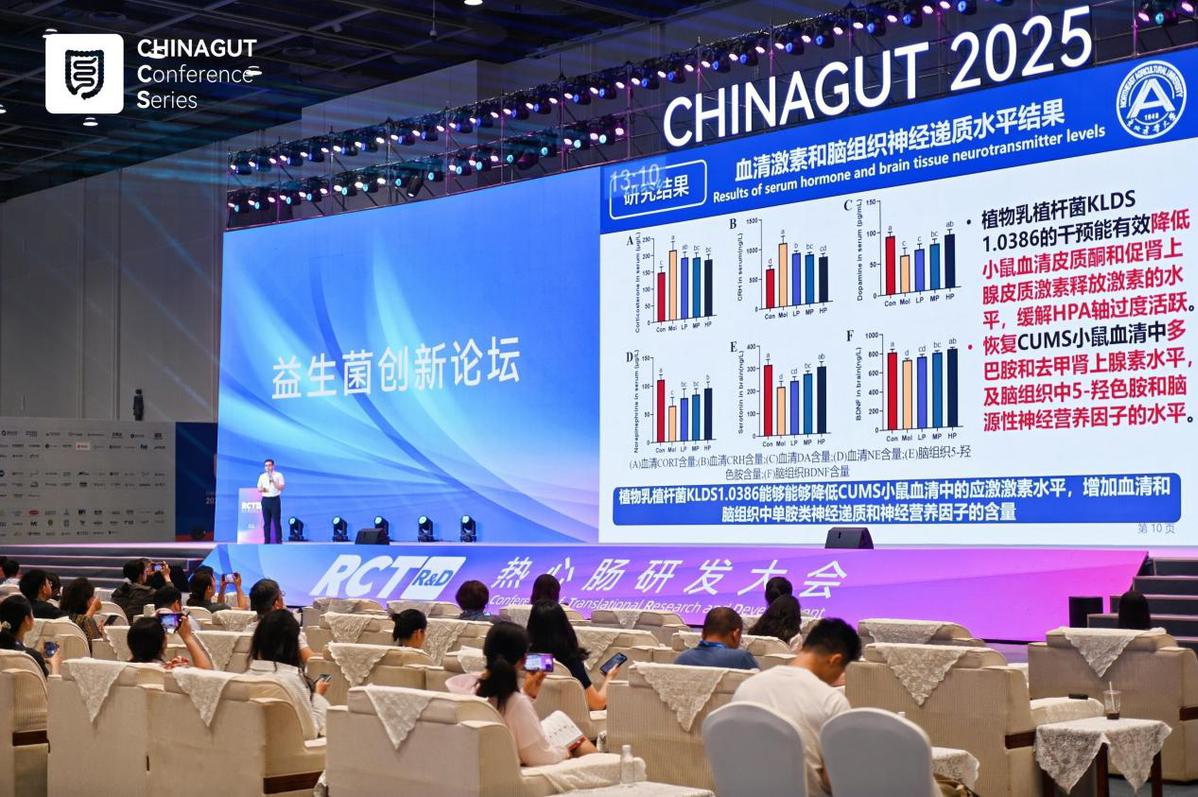 众多的科研成果是植物乳植杆菌KLDS1.0386的靓丽标签。李教授在报告中详细阐述了植物乳植杆菌KLDS1.0386在调节多巴胺、血清素、去甲肾上腺素等神经递质方面的优异表现,同时揭示了植物乳植杆菌KLDS1.0386通过“肠-脑轴”介导改善专注力与情绪调节功能的深层机制。
