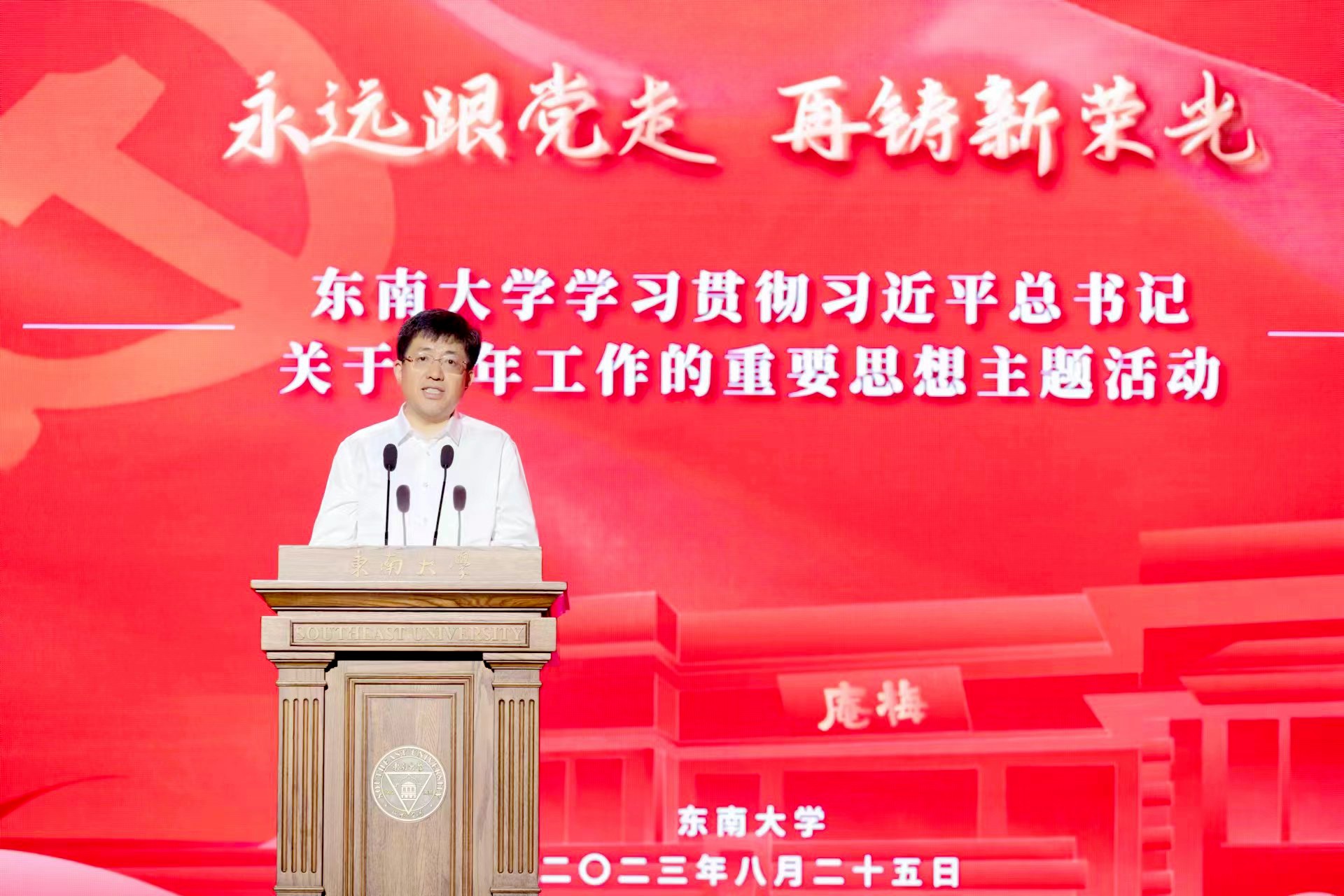 左惟指出,建校121年来,东南大学始终将家国担当作为永恒的价值追求,孕育出“以科学名世,以人才报国”的办学理念,以鲜明的红色基因铸就了光荣的革命传统。其中,东南大学党委高度重视1923年8月在梅庵召开的“团二大”文物和史料的收集、整理和保护工作,以此作为生动教材,激励一代又一代东大青年汇聚在党的旗帜下,奋勇拼搏、砥砺前行。今后,东南大学将坚持用习近平新时代中国特色社会主义思想凝心铸魂,持续深入学习贯彻习近平总书记关于青年工作的重要思想,用心、用力、用情做好青年工作,激励东大青年增强历史责任感和使命感,激发强国有我的青春激情,着力培养担当民族复兴大任的领军人才,以卓有成效的青年工作推动学校各项事业高质量发展,加快走出中国特色世界一流大学建设的“东大新路”。希望全体东大青年牢记习近平总书记的殷殷嘱托,不负韶华,不负时代,不负人民,在实现民族复兴的赛道上奋勇争先,在中国式现代化建设中挺膺担当,让青春在强国建设、民族复兴的火热实践中绽放绚丽之花!