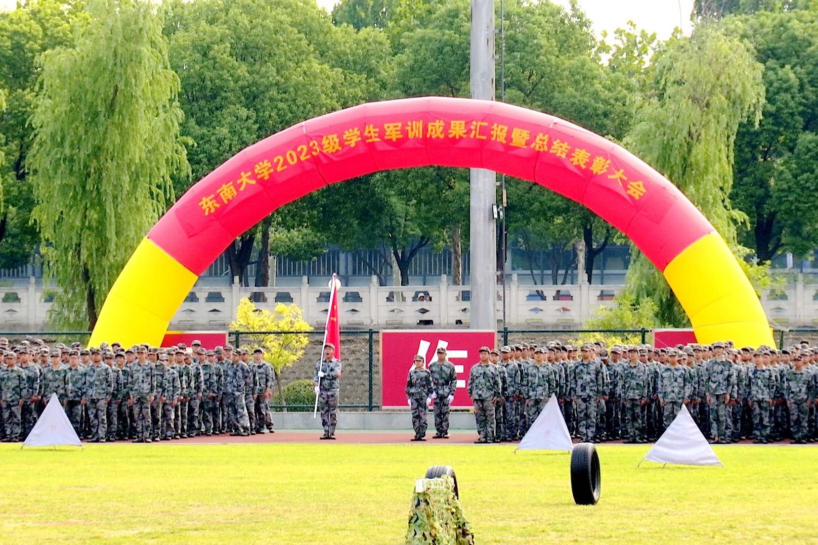 邢纪红在大会上发表讲话,代表学校向圆满完成军训任务的2023级本科生同学表示热烈的祝贺,对于辛勤付出的教官和相关部门同志表示衷心的感谢。他指出,加强全民国防教育是维护国家国防安全的迫切要求,希望各位同学将这次军训养成的优良作风与拼搏精神融入今后的学习生活中,不负时代,不负韶华,努力提升自身的思辨力、学习力、创造力、领导力,用坚韧不拔的意志和熊熊燃烧的激情,在东大校园绽放最美的青春,在人生赛道上跑出这一代青年的最好成绩!